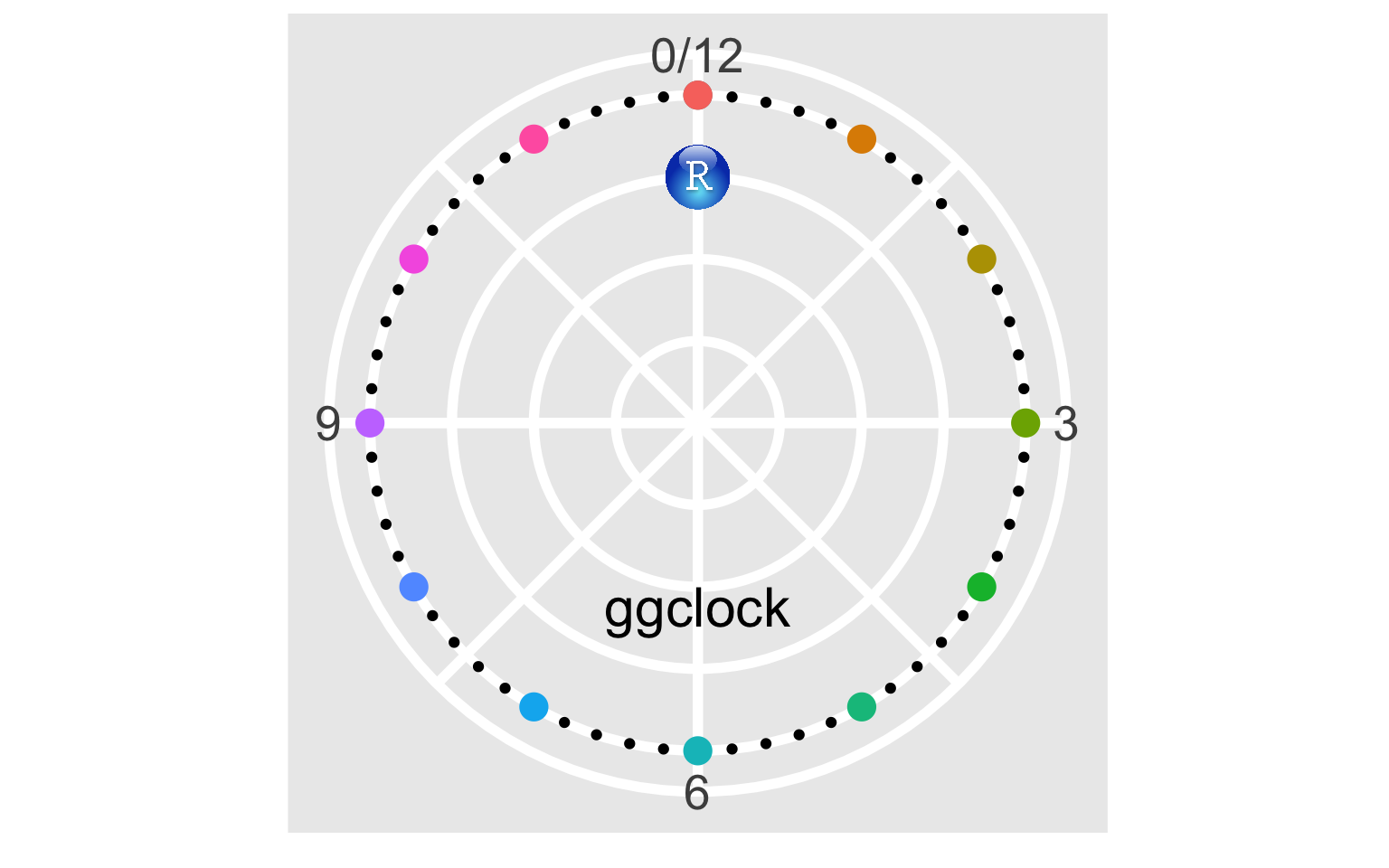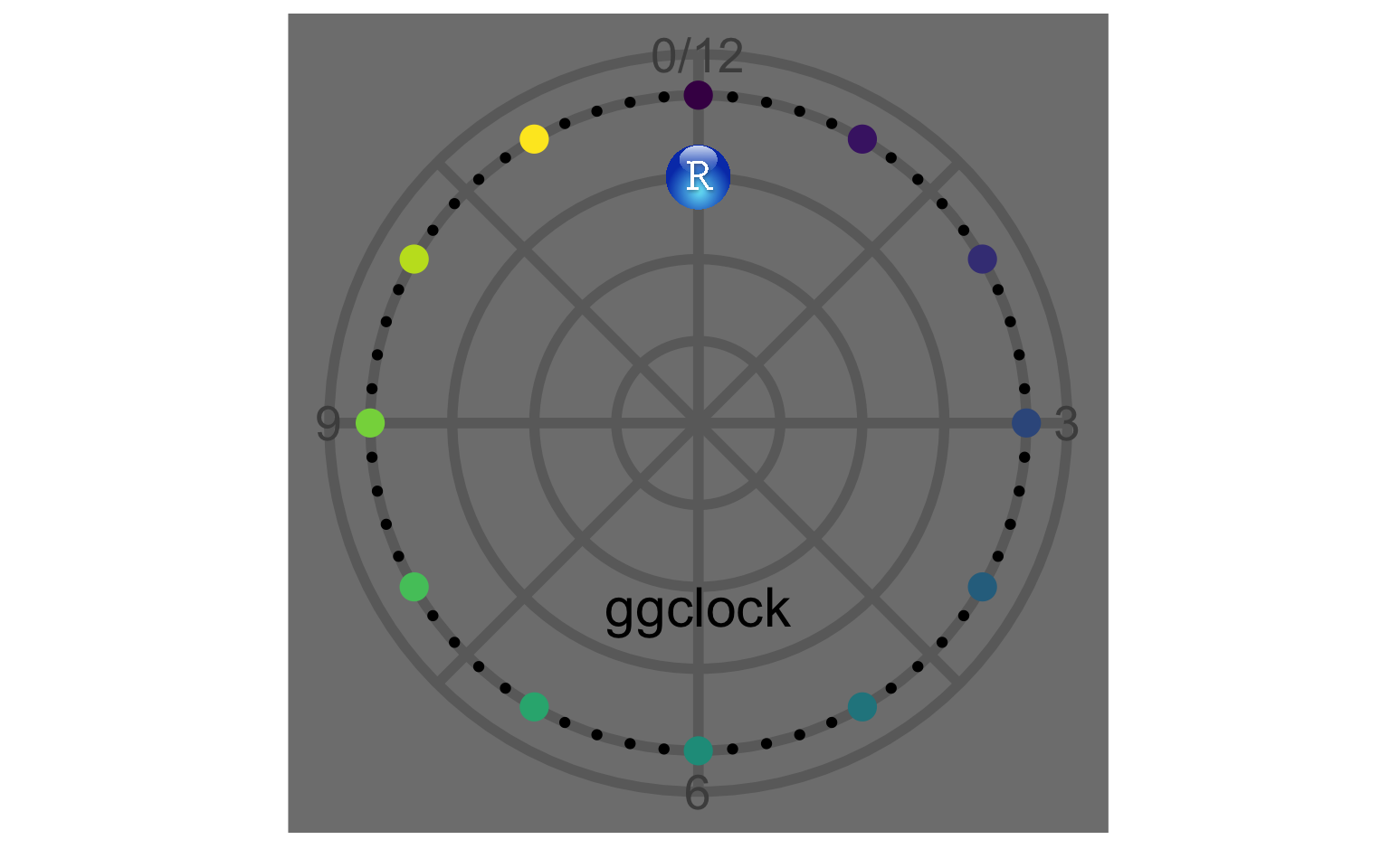And now we have our clock face! There are just a couple of details remaining to fully replicate the original: the “ggclock” text, and the RStudio ball. The text can be added using geom_text.