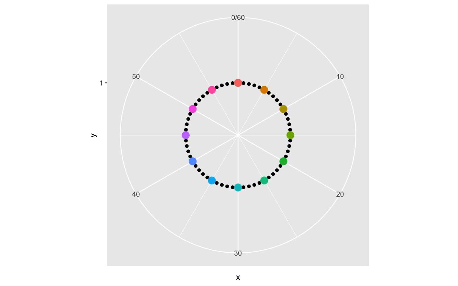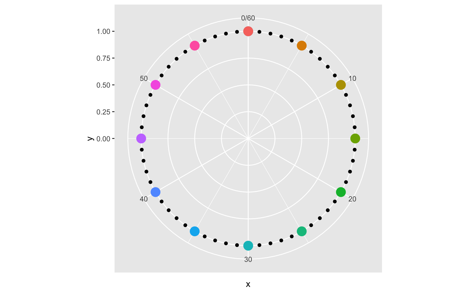 We start by plotting each of the point (minutes and hours). Consistent with the original ggclock, we will make the hour markers slightly larger and colored, with the colors starting at 12 o’clock (the 60 minute mark).