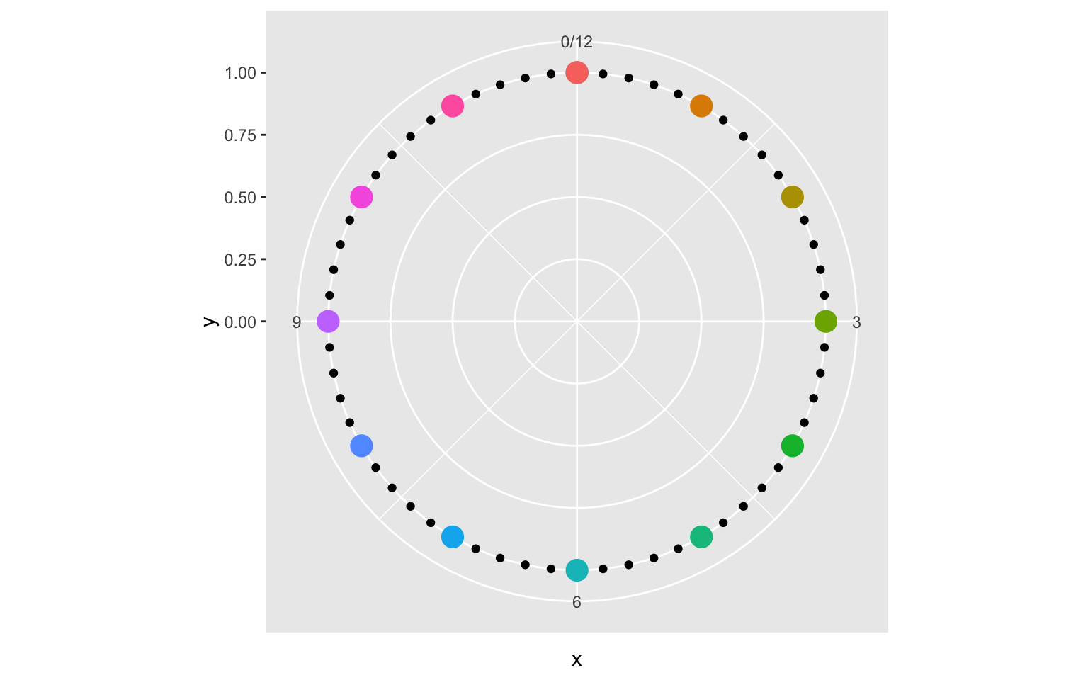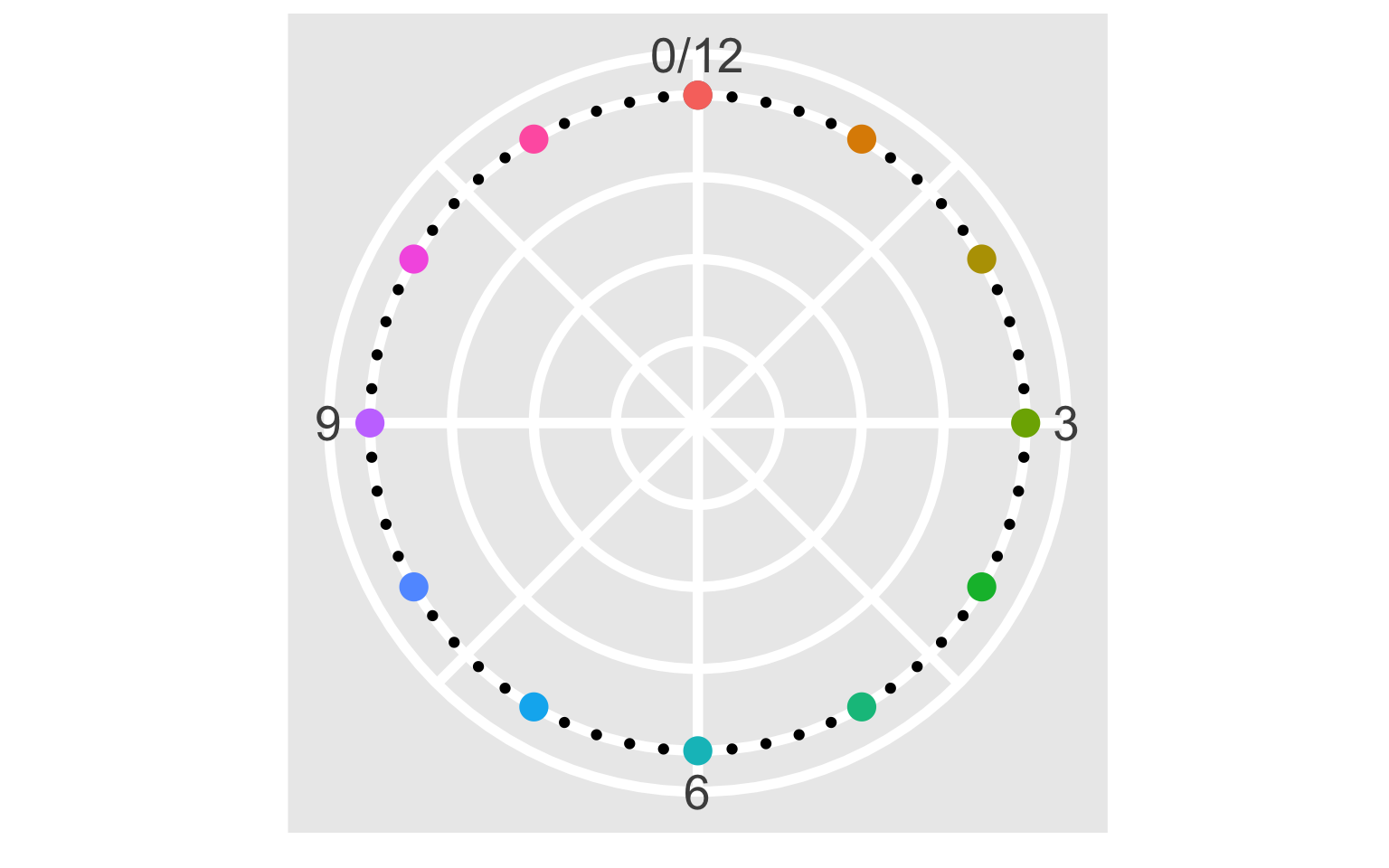 Next, we can set the breaks of the x-axis to show the necessary hour marks. We can also set the breaks of the y-axis, which control the circles on the interior of the clock.